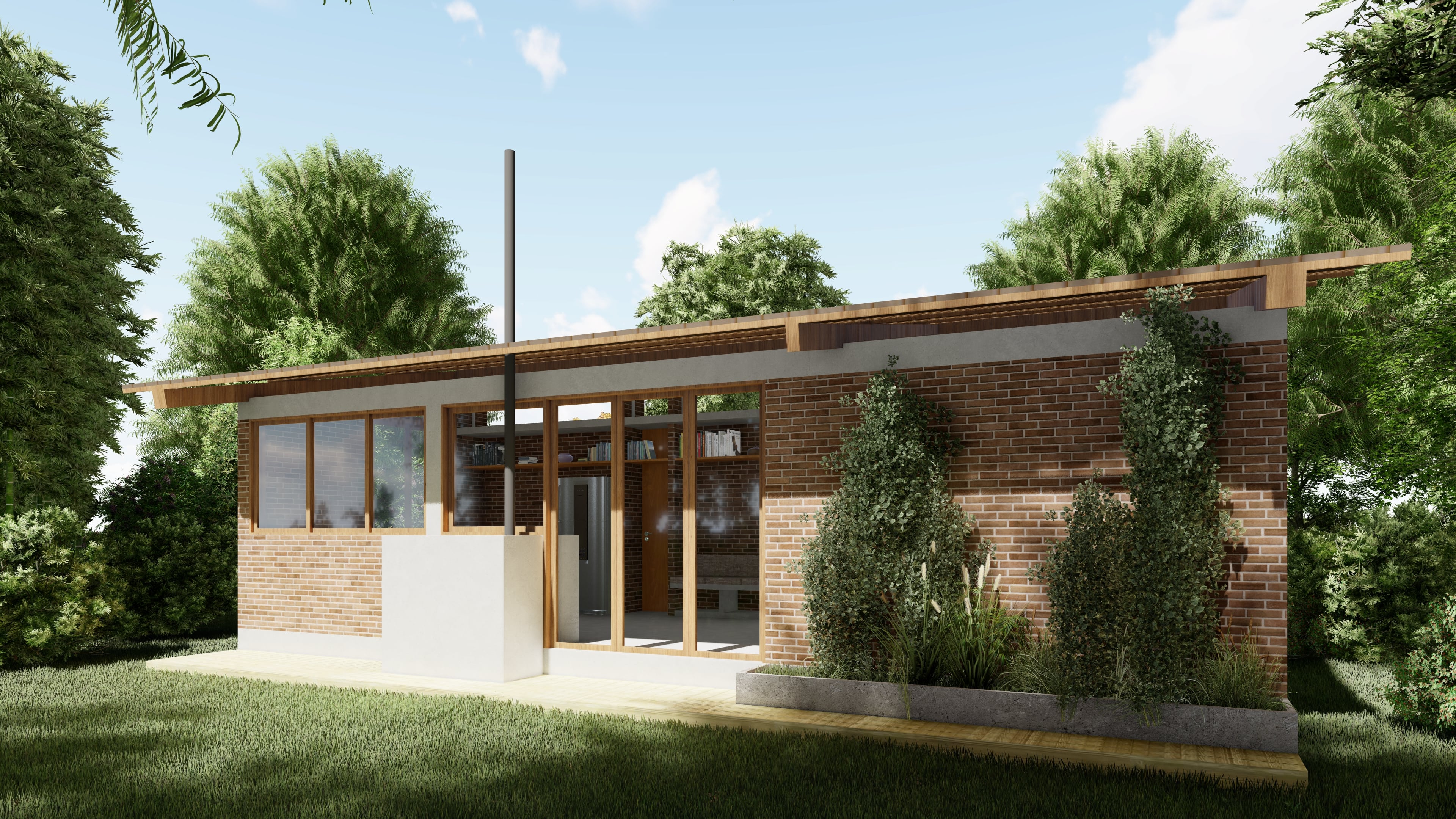 Para a Casa Sede foi necessário conciliar o programa solicitado com uma área de implantação compacta, sem comprometer a qualidade espacial dos ambientes ou exceder a área permitida de projeção. Deste modo, optou-se pela manutenção de uma casa térrea, com telhado de duas águas e aberturas estratégicas, de modo a minimizar os custos da construção. A casa apresenta um eixo norte-sul de acesso principal que organiza seu programa de acordo com a necessidade dos moradores. Ao sul, o acesso coletivo pela sala, cozinha e varanda integradas, com uma grande abertura em vidro para a praça coletiva do terreno. Ao norte, outro acesso, pela lavanderia, área também destinada às atividades de manejo e cuidado da terra. Ao centro do corredor, um lanternim com uma esquadria articulada, que permite a saída do ar quente durante o verão e maior entrada de luz durante o inverno.