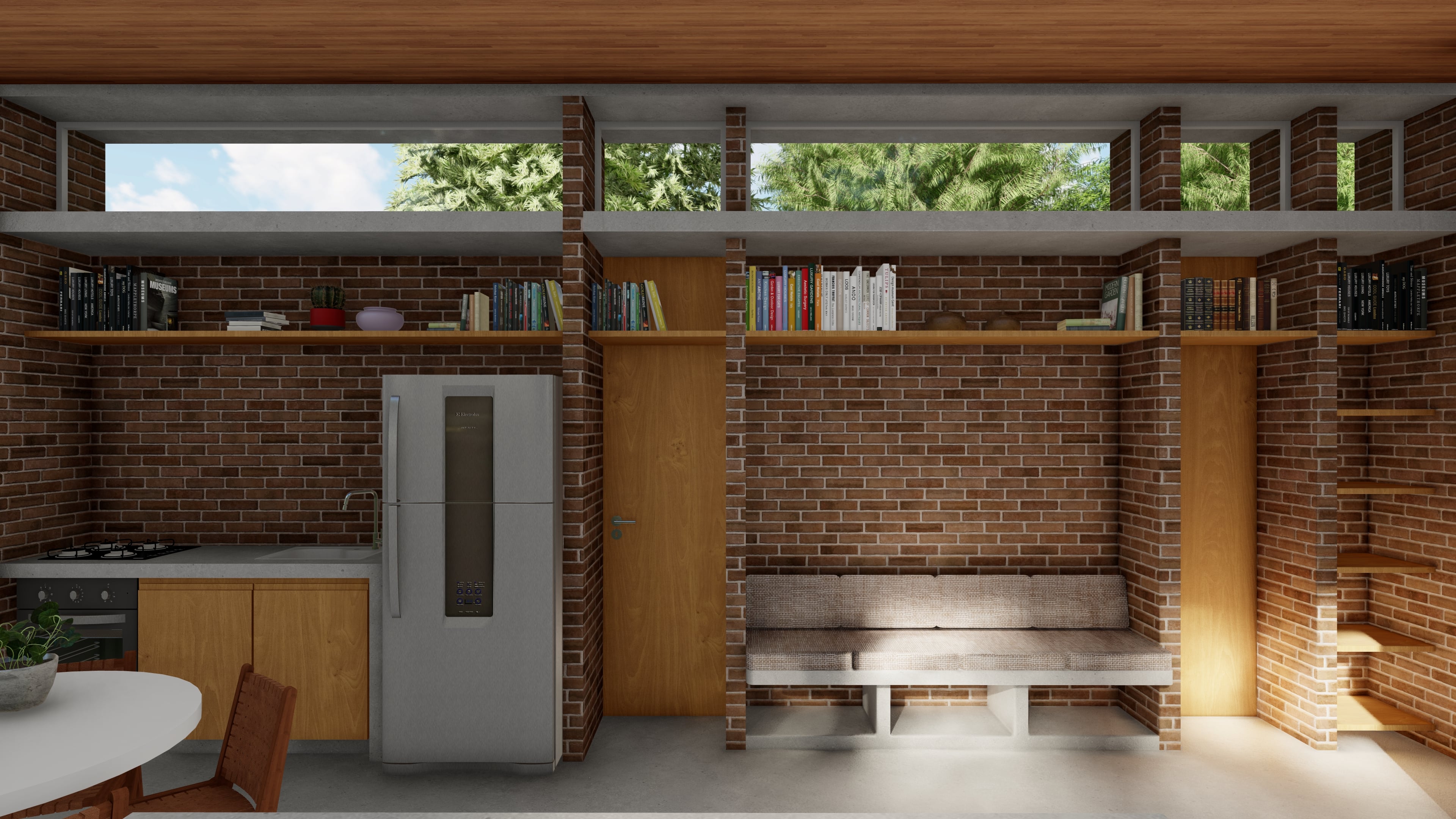 O projeto da Casinha foi fundamentado na mesma lógica da Casa Sede, acompanhando o perímetro da construção original e buscando soluções e técnicas construtivas de menor impacto ambiental, logístico e econômico.Para otimizar a planta e a relação espacial, toda a área coletiva foi desenhada em um mesmo ambiente, integrado. Através da nervura da parede longitudinal, o projeto organiza todas as áreas de bancadas e armários necessários na casa e possui, na nervura superior da parede, uma linha de esquadrias fixas de vidro, possibilitando grande entrada de luz natural na edificação.